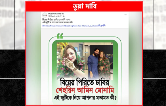 সম্প্রতি সামাজিক যোগাযোগমাধ্যমে “ঢাবির শিক্ষক শেহরীন আমিন ভূঁইয়া (মোনামী) ও অভিনেতা আসাদুজ্জামান আসাদের বিয়ে” শিরোনামে দুইটি ছবি ছড়িয়ে পড়েছে। পোস্টগুলোতে দাবি করা হচ্ছে, তারা বিয়ের পিঁড়িতে বসেছেন।