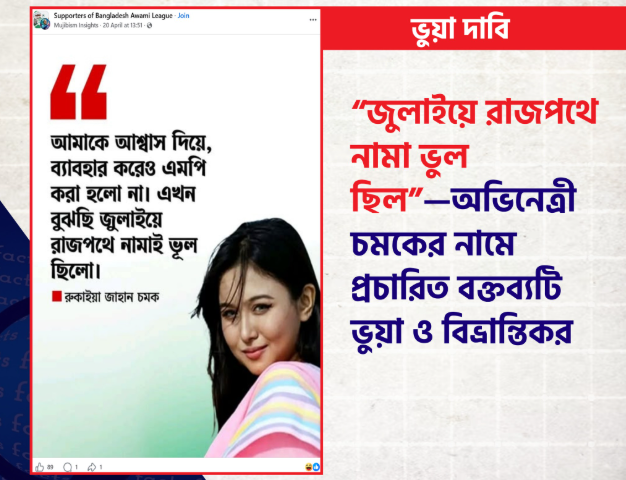 ফলে, অভিনেত্রী চমকের নামে প্রচারিত “জুলাইয়ে রাজপথে নামা ভুল ছিল” শীর্ষক মন্তব্যটি সম্পূর্ণ মিথ্যা, বানোয়াট এবং বিভ্রান্তিকর।