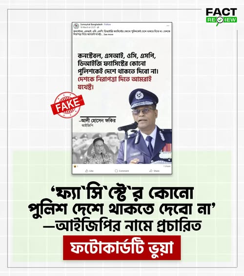 সাম্প্রতিক সময়ে সামাজিক যোগাযোগমাধ্যমে একটি ফটোকার্ড ছড়িয়ে পড়েছে, যেখানে পুলিশ মহাপরিদর্শক (আইজিপি) আলী হোসেন ফকির-এর নামে একটি বক্তব্য প্রচার করা হচ্ছে। সেখানে দাবি করা হয়েছে, তিনি নাকি বলেছেন—“কনস্টেবল, এসআই, ওসি, এসপি, ডিআইজি—ফ্যাসিস্টের কোনো পুলিশকেই দেশে থাকতে দেবো না। দেশকে নিরাপত্তা দিতে আমরাই যথেষ্ট।”