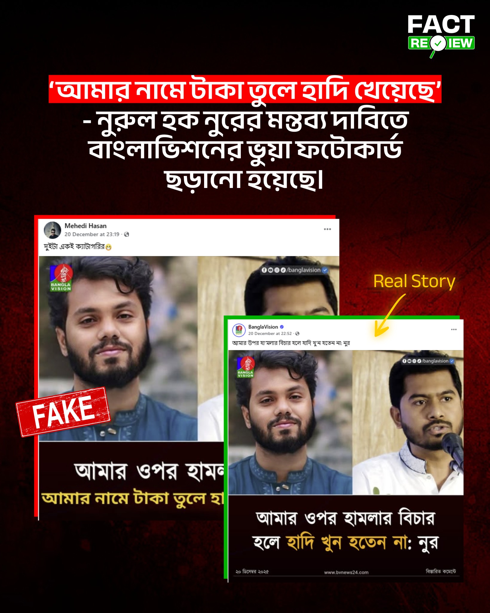 মূলত ২০ ডিসেম্বর বাংলাভিশনের মূল ফটোকার্ডে নুরুল হক নুরের বক্তব্য ছিল—“আমার ওপর হামলার বিচার হলে হাদি খুন হতেন না।” সেই আসল ফটোকার্ডের ছবি ও ডিজাইন অপরিবর্তিত রেখে কেবল শিরোনাম পাল্টে ভুয়া দাবি যুক্ত করা হয়েছে।