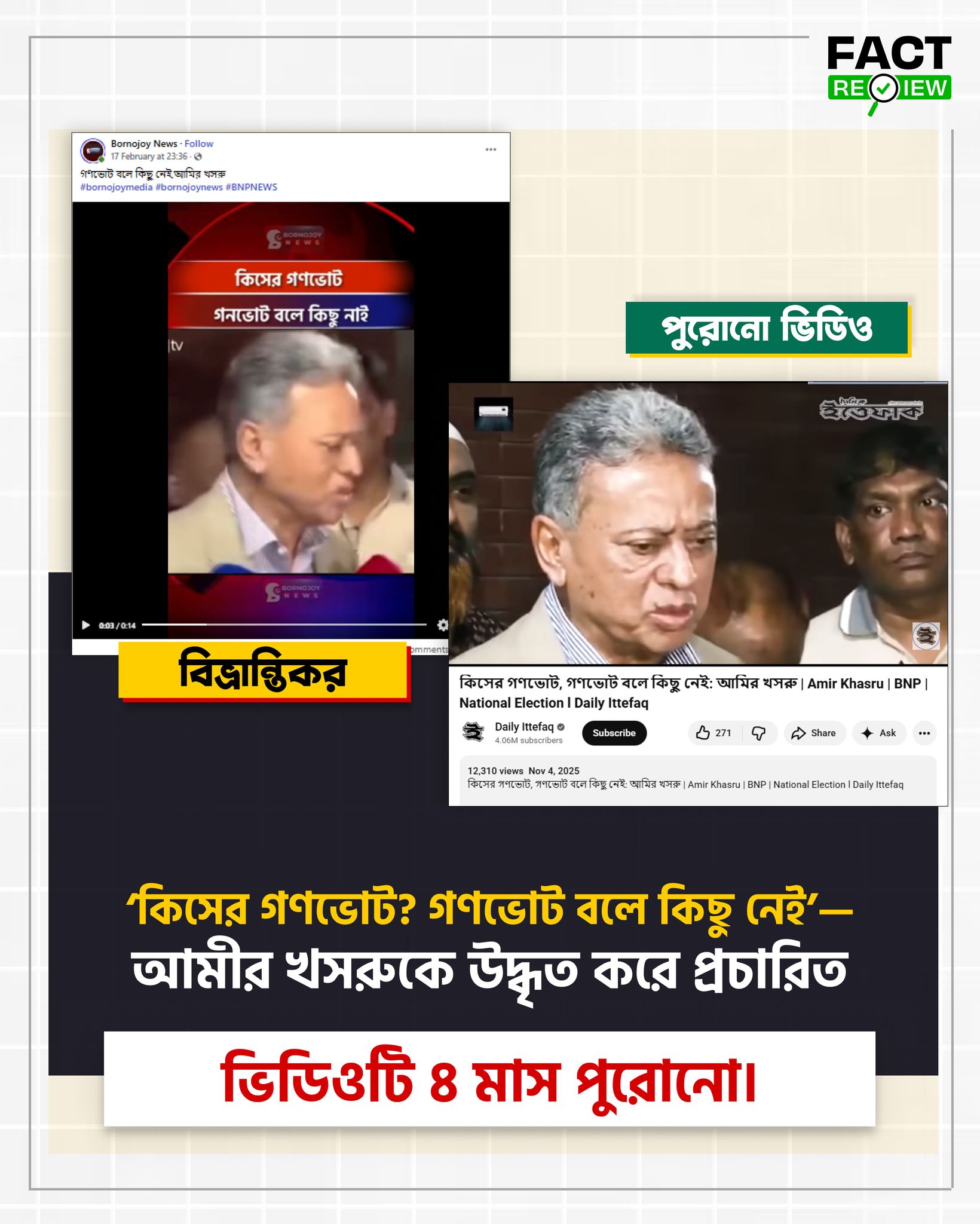 সামাজিক যোগাযোগমাধ্যমে সম্প্রতি ‘কিসের গণভোট? গণভোট বলে কিছু নেই’— শিরোনামে একটি ভিডিও ছড়িয়ে পড়েছে, যেখানে বিএনপির নেতা আমীর খসরু মাহমুদ চৌধুরীকে গণভোট বিষয়ে নেতিবাচক মন্তব্য করতে শোনা যায়। ভিডিওটি এমনভাবে প্রচার করা হচ্ছে, যেন এটি বিএনপি সরকার গঠনের পর দেওয়া সাম্প্রতিক বক্তব্য। ফলে বিষয়টি নিয়ে জনমনে বিভ্রান্তি তৈরি হয়েছে।