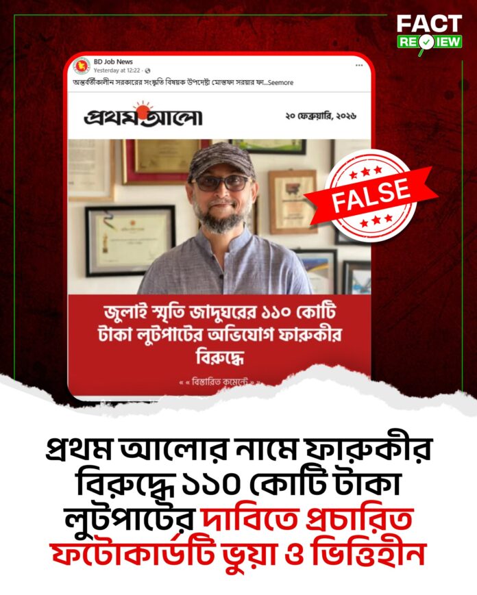‘জুলাই স্মৃতি জাদুঘরের ১১০ কোটি টাকা লুটপাটের অভিযোগ ফারুকীর বিরুদ্ধে’—এমন শিরোনামে প্রথম আলোর ডিজাইন সম্বলিত একটি ফটোকার্ড সম্প্রতি সামাজিক যোগাযোগমাধ্যমে ছড়িয়ে পড়েছে। তবে আলোচিত ফটোকার্ডটি যাচাই করে দেখা গেছে, এটি প্রথম আলো প্রকাশ করেনি।