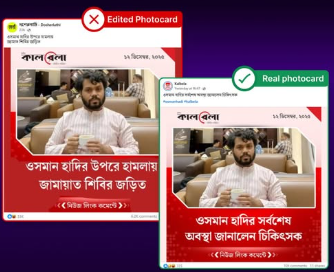 ফটোকার্ডে উল্লেখিত তারিখ অনুযায়ী কালবেলা–র অফিসিয়াল ফেসবুক পেজে অনুসন্ধান চালিয়ে উক্ত শিরোনামের কোনো ফটোকার্ডের অস্তিত্ব পাওয়া যায়নি। তবে একই ডিজাইনের একটি ভিন্ন ফটোকার্ড কালবেলা–র অফিসিয়াল পেজে পাওয়া গেছে, যার শিরোনাম ছিল—‘উসমান হাদির সর্বশেষ অবস্থা জানালেন চিকিৎসক’।