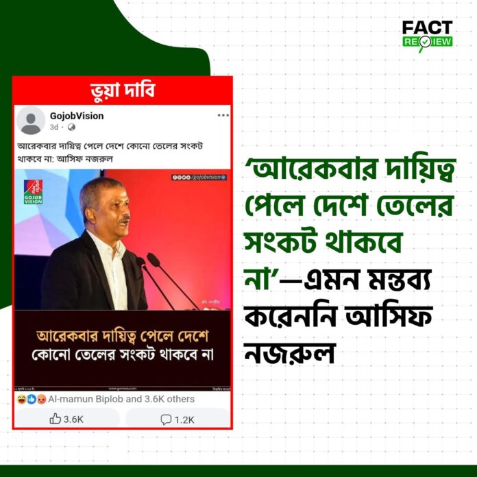সামাজিক যোগাযোগমাধ্যমে একটি ফটোকার্ড ছড়িয়ে পড়েছে, যেখানে দাবি করা হচ্ছে—অন্তর্বর্তী সরকারের সাবেক আইন উপদেষ্টা ড. আসিফ নজরুল নাকি বলেছেন, “আরেকবার দায়িত্ব পেলে দেশে তেলের সংকট থাকবে না।” পোস্টটি বিভিন্ন মাধ্যমে শেয়ার হয়ে বিভ্রান্তি তৈরি করছে।