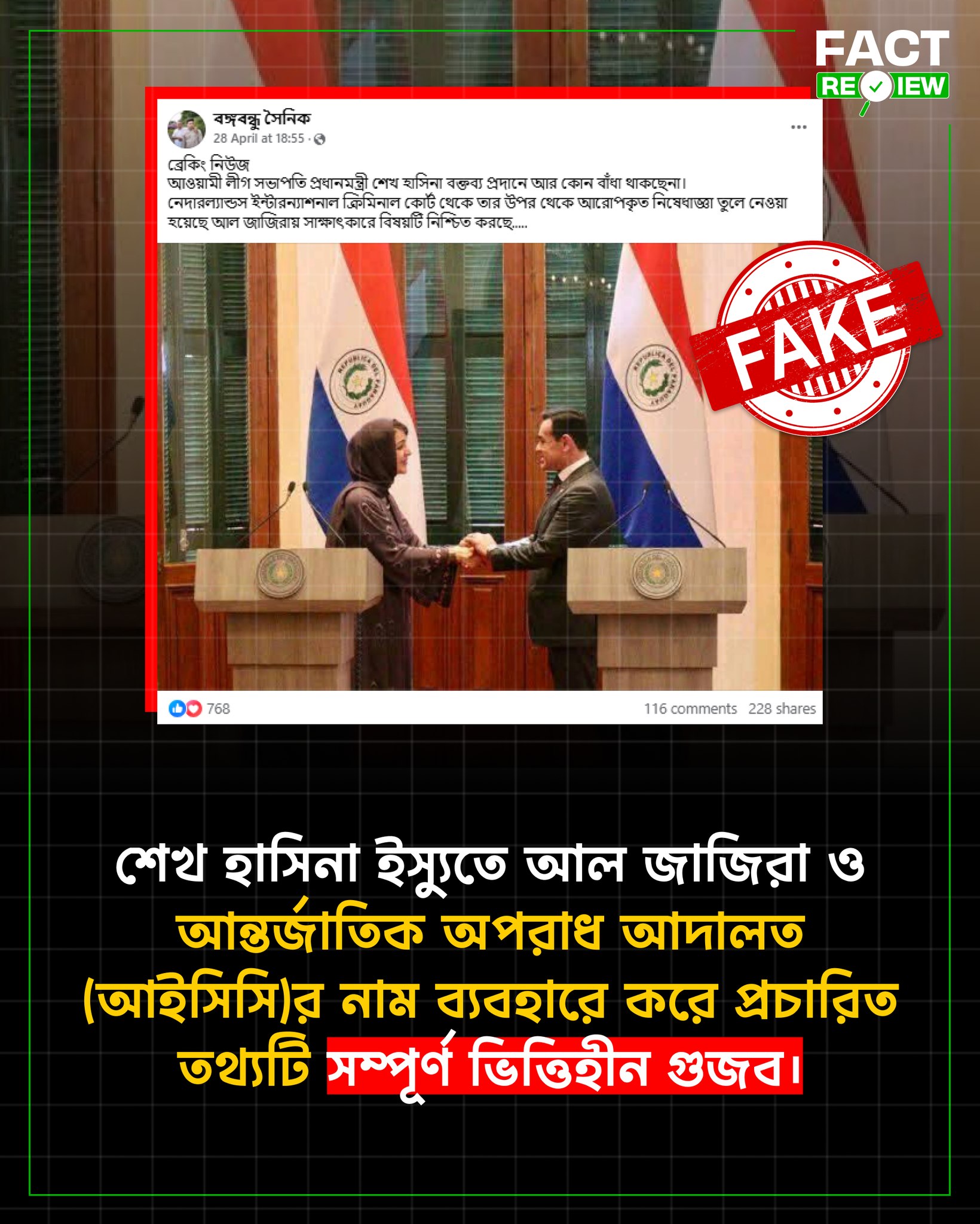 এছাড়া, ইন্টারন্যাশনাল ক্রিমিনাল কোর্ট কর্তৃক শেখ হাসিনার বিরুদ্ধে কোনো বক্তব্য নিষেধাজ্ঞা জারি করা হয়েছে—এমন কোনো তথ্য বিশ্বস্ত সূত্রে পাওয়া যায়নি। ফলে শেখ হাসিনাকে ঘিরে আল জাজিরা ও আইসিসির নাম ব্যবহার করে প্রচারিত দাবি সম্পূর্ণ ভুয়া ও ভিত্তিহীন।