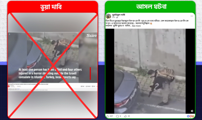 সাম্প্রতিক সময়ে সামাজিক যোগাযোগমাধ্যমে একটি ভিডিও ছড়িয়ে পড়েছে, যেখানে দাবি করা হচ্ছে তুরস্কের ইস্তাম্বুলে অবস্থিত ইসরায়েলি কনসুলেটে বন্দুকধারীদের হামলায় বেশ কয়েকজন ইসরায়েলি নাগরিক নিহত ও আহত হয়েছেন।