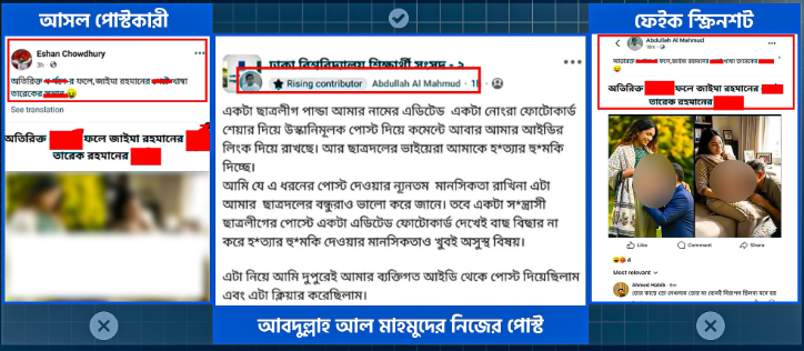 এছাড়া অনুসন্ধানে দেখা যায়, আওয়ামী লীগপন্থী কয়েকটি এক্টিভিস্ট আইডি প্রথমদিকে এই এডিটেড স্ক্রিনশটটি ছড়িয়ে দেয়। পোস্টগুলোর ভাষা বিশ্লেষণে প্রতীয়মান হয়, এটি কেবল তথ্য প্রচার নয়; বরং উদ্দেশ্যপ্রণোদিতভাবে উস্কানিমূলক কনটেন্ট ছড়িয়ে ছাত্ররাজনীতির ভেতরে বিভাজন ও উত্তেজনা তৈরির চেষ্টা করা হয়েছে।