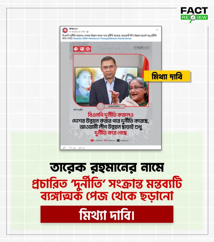 অর্থাৎ, একটি ব্যঙ্গাত্মক পেজের কনটেন্টকে বাস্তব মন্তব্য হিসেবে প্রচার করে বিভ্রান্তি সৃষ্টি করা হয়েছে। ফলে তারেক রহমান উল্লিখিত মন্তব্য করেছেন—এ দাবিটি সম্পূর্ণ মিথ্যা এবং ভিত্তিহীন।