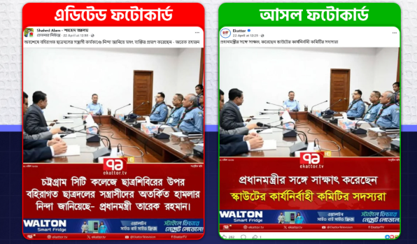 পর্যালোচনায় দেখা যায়, আলোচিত ফটোকার্ডটি আসলে একাত্তর টিভির পূর্বে প্রকাশিত একটি আসল ফটোকার্ডের ডিজিটাল সম্পাদিত সংস্করণ। মূল ফটোকার্ডে “প্রধানমন্ত্রীর সঙ্গে সাক্ষাৎ করেছেন স্কাউটের কার্যনির্বাহী কমিটির সদস্যরা” শীর্ষক সংবাদ ছিল। কিন্তু সেটির ডিজাইন, ছবি ও বিন্যাস অপরিবর্তিত রেখে শিরোনাম পরিবর্তন করে ভুয়া বক্তব্য যুক্ত করা হয়েছে।