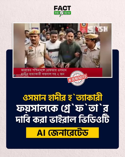 ভারতের পশ্চিমবঙ্গ থেকে ওসমান হাদীর হত্যাকারী ফয়সালসহ দুইজন গ্রেফতার হওয়ার দাবিতে একটি ভিডিও সামাজিক মাধ্যমে ভাইরাল হয়েছে। তবে যাচাই‑বাছাইয়ে দেখা গেছে, ভিডিওটি AI দ্বারা তৈরি।