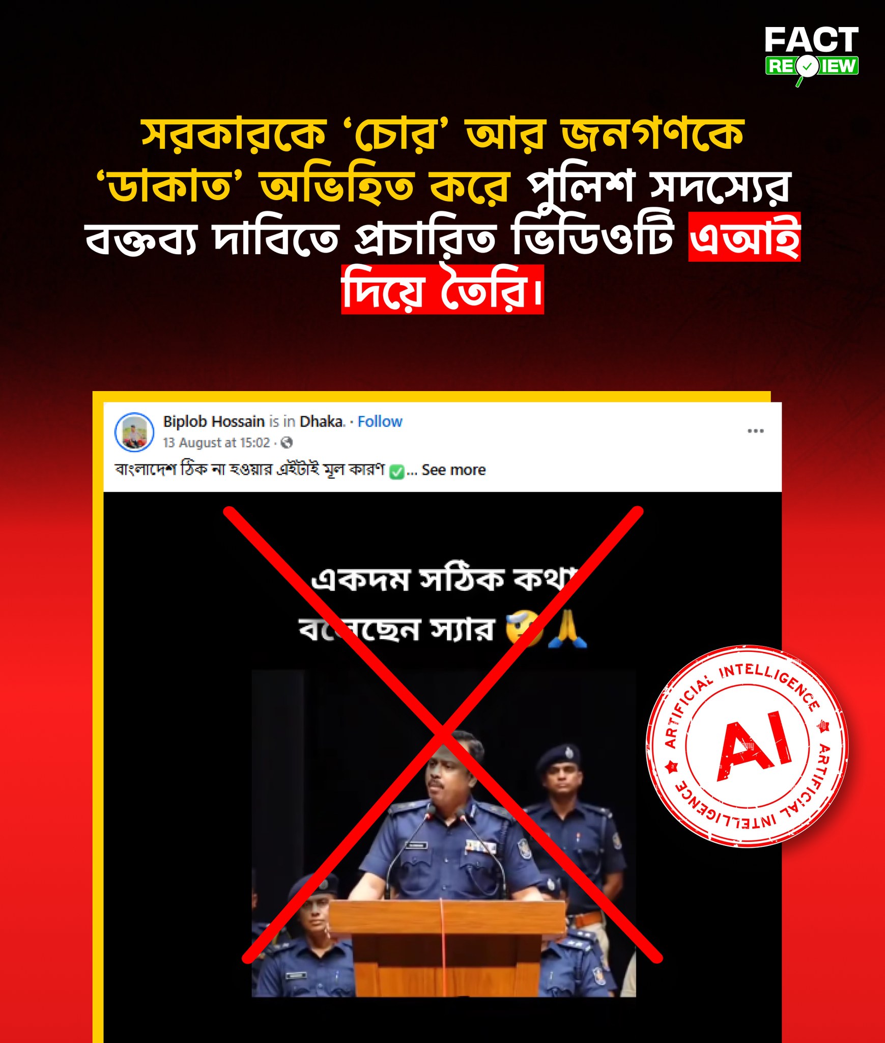 অতএব, কথিত পুলিশ কর্মকর্তার নামে প্রচারিত ভিডিওটি সম্পূর্ণ ভুয়া, যা এআই দিয়ে তৈরি এবং জনমনে বিভ্রান্তি ছড়ানোর উদ্দেশ্যে প্রচার করা হয়েছে।