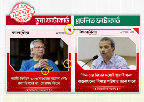 সাম্প্রতিক সময়ে সামাজিক যোগাযোগমাধ্যমে একটি ফটোকার্ড ছড়িয়েছে, যেখানে দাবি করা হচ্ছে যে অন্তর্বর্তীকালীন সরকারের প্রধান উপদেষ্টা ড. মুহাম্মদ ইউনূস নাকি বলেছেন—“জাতীয় নির্বাচন ২০২৬ সালে হওয়ার সম্ভাবনা নেই।” ফটোকার্ডটিতে জাতীয় দৈনিক কালবেলা-র লোগোও ব্যবহার করা হয়েছে।