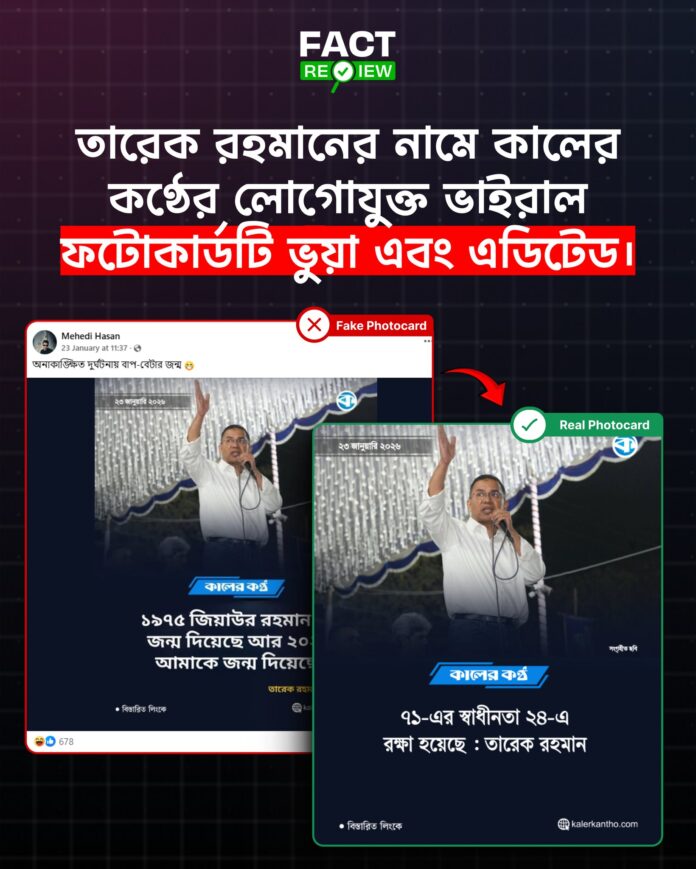 সম্প্রতি সামাজিক যোগাযোগমাধ্যমে জাতীয় দৈনিক কালের কণ্ঠের লোগো সংবলিত একটি ফটোকার্ড ছড়িয়ে দাবি করা হয়, বিএনপির চেয়ারম্যান তারেক রহমান বলেছেন—“১৯৭৫ জিয়াউর রহমান কে জন্ম দিয়েছে আর ২০২৪ আমাকে জন্ম দিয়েছে।” ফটোকার্ডটিতে প্রকাশের তারিখ হিসেবে ২৩ জানুয়ারি ২০২৬ উল্লেখ ছিল।