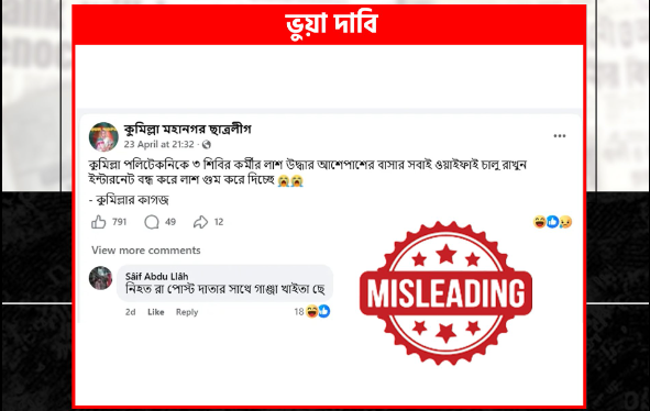 সম্প্রতি সামাজিক যোগাযোগমাধ্যমে দাবি করা হয় যে, কুমিল্লা পলিটেকনিক ইনস্টিটিউটে সংঘর্ষের ঘটনায় তিনজন শিবির কর্মীর লাশ উদ্ধার করা হয়েছে। পোস্টে স্থানীয় দৈনিক ‘কুমিল্লার কাগজ’-এর নাম ব্যবহার করে বলা হয়, এই মৃত্যুর খবর পত্রিকাটি প্রকাশ করেছে। ফলে বিষয়টি দ্রুত অনলাইনে ছড়িয়ে পড়ে এবং জনমনে বিভ্রান্তি তৈরি হয়।