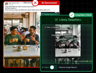 ‘ওসমান হাদির খুনির সঙ্গে সাদিক কায়েমের চায়ের আড্ডা’ শিরোনামে সামাজিক যোগাযোগমাধ্যমে একটি ছবি ব্যাপকভাবে ছড়িয়ে পড়েছে। তবে অনুসন্ধানে দেখা যায়, ছবিটি এআই দিয়ে তৈরি। কৃত্রিম ছবি ও ভিডিও শনাক্তকারী প্ল্যাটফর্ম AI or Not–এর বিশ্লেষণ অনুযায়ী, ছবিটি likely deepfake বলে নিশ্চিত হয়েছে।