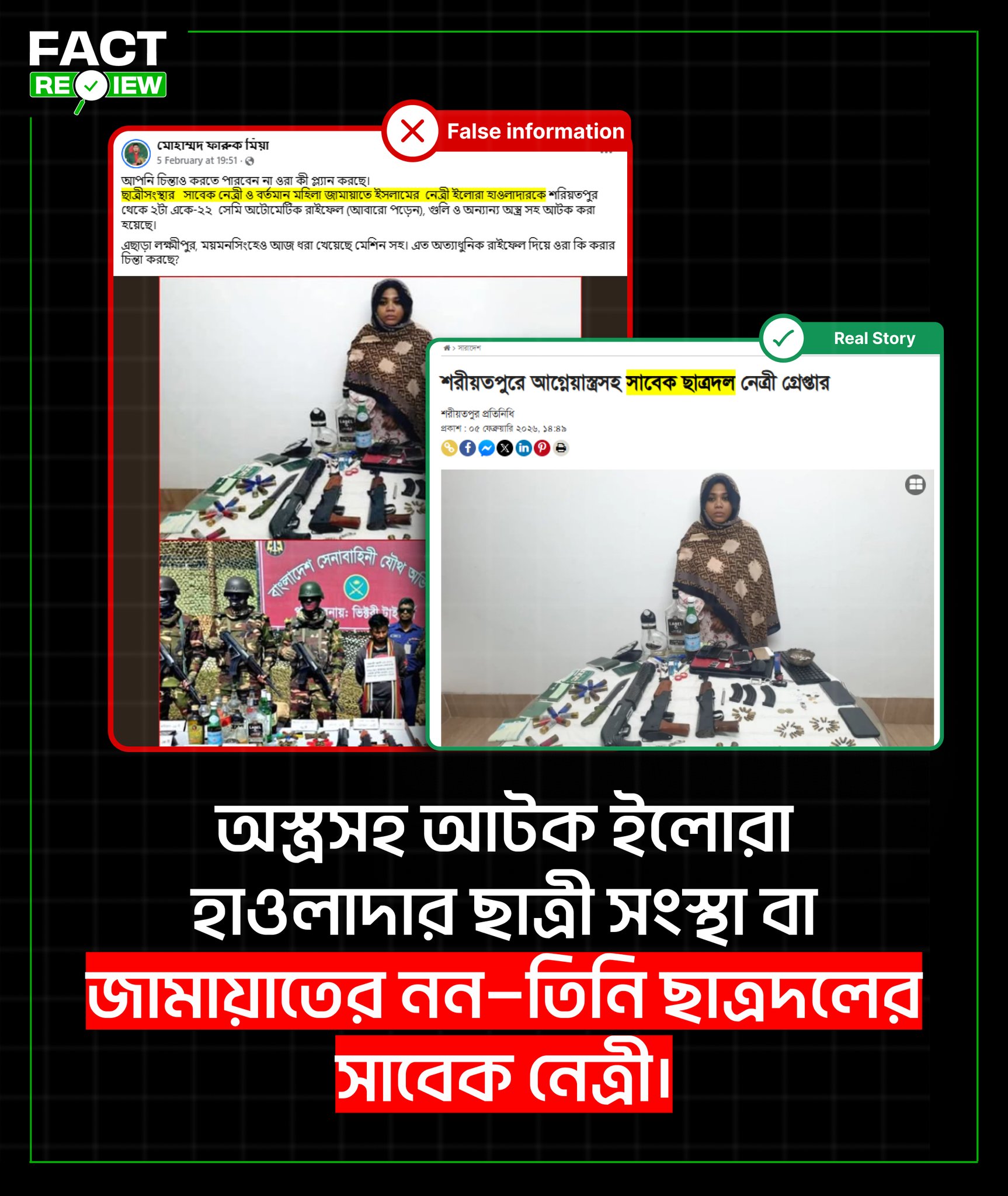 সম্প্রতি সামাজিক যোগাযোগমাধ্যমে একটি পোস্ট ছড়িয়ে পড়ে, যেখানে দাবি করা হয়—ছাত্রী সংস্থার সাবেক নেত্রী ও মহিলা জামায়াতে ইসলামের বর্তমান নেত্রী ইলোরা হাওলাদারকে শরীয়তপুর থেকে আগ্নেয়াস্ত্রসহ আটক করা হয়েছে। তবে ফ্যাক্টচেকে দেখা গেছে, এই দাবিটি বিভ্রান্তিকর। গ্রেপ্তার হওয়া নারী ইসমত জাহান ওরফে ইলোরা হাওলাদার আসলে জেলা ছাত্রদলের সাবেক যুগ্ম আহ্বায়ক ছিলেন।