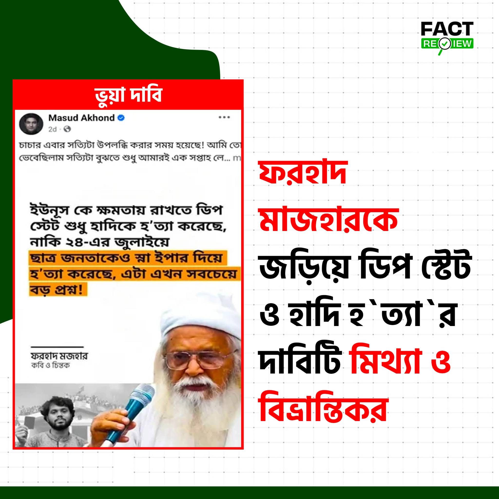 সম্প্রতি সামাজিক যোগাযোগমাধ্যমে একটি ফটোকার্ড ছড়িয়ে পড়েছে, যেখানে কবি ও চিন্তক ফরহাদ মাজহারকে জড়িয়ে দাবি করা হয়েছে—“ইউনূসকে ক্ষমতায় রাখতে ডিপ স্টেট শুধু হাদিকে হত্যা করেছে, নাকি ২৪-এর জুলাইয়ে ছাত্র জনতাকেও স্নাইপার দিয়ে হত্যা করেছে, এটা এখন সবচেয়ে বড় প্রশ্ন।”