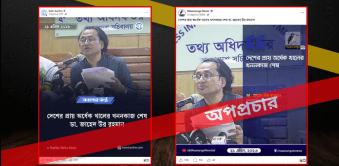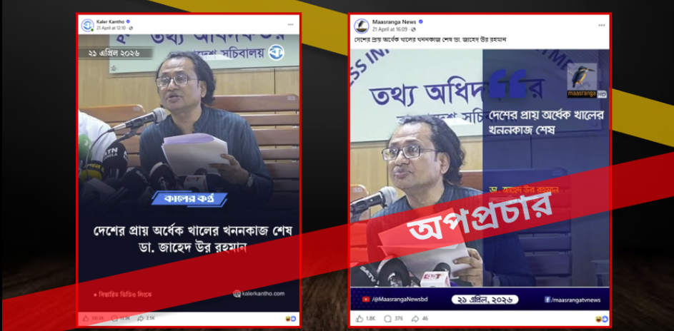 তবে অনুসন্ধানে দেখা যায়, এই উপস্থাপনাটি বিভ্রান্তিকর। গত ২১ এপ্রিল সচিবালয়ে অনুষ্ঠিত এক সংবাদ সম্মেলনে ড. জাহেদ উর রহমান যে বক্তব্য দেন, সেখানে তিনি স্পষ্টভাবে খনন কর্মসূচিভুক্ত খালগুলোর অগ্রগতি নিয়ে কথা বলছিলেন। তার ভাষ্য অনুযায়ী, কর্মসূচির আওতায় থাকা ৬৪৫টি খালের মধ্যে প্রায় ৪৪.৫৫ শতাংশ কাজ সম্পন্ন হয়েছে—যা “প্রায় অর্ধেক” হিসেবে উল্লেখ করা হয়েছে।