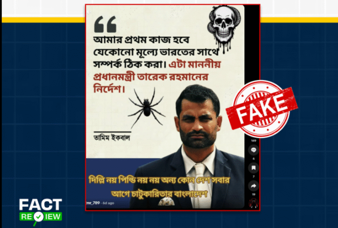 সম্প্রতি সামাজিক যোগাযোগমাধ্যমে বাংলাদেশ ক্রিকেট বোর্ডের (বিসিবি) নবনিযুক্ত অ্যাডহক কমিটির প্রধান তামিম ইকবাল–এর নামে একটি ফটোকার্ড ছড়িয়ে পড়ে, যেখানে দাবি করা হয় তিনি নাকি ভারতকে ঘিরে সম্পর্ক উন্নয়ন এবং রাজনৈতিক নির্দেশনা নিয়ে মন্তব্য করেছেন।