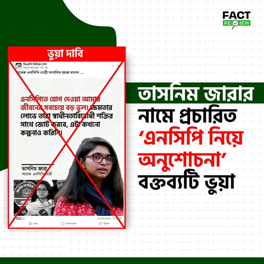 সামাজিক যোগাযোগমাধ্যমে সম্প্রতি একটি উক্তি ছড়িয়ে পড়েছে, যেখানে দাবি করা হচ্ছে সাবেক এনসিপি নেত্রী তাসনিম জারা বলেছেন, এনসিপিতে যোগ দেওয়া তার জীবনের সবচেয়ে বড় ভুল এবং দলটি ক্ষমতার লোভে স্বাধীনতাবিরোধী শক্তির সঙ্গে জোট করতে পারে।