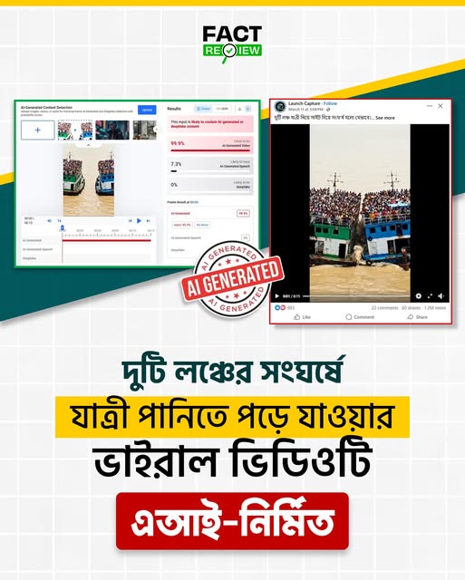 এছাড়া, এমন কোনো লঞ্চ দুর্ঘটনার বিষয়ে নির্ভরযোগ্য গণমাধ্যম বা সরকারি সূত্রে তথ্য পাওয়া যায়নি। ফলে ভাইরাল হওয়া দুটি লঞ্চের সংঘর্ষের ভিডিওটি সম্পূর্ণ ভুয়া, এআই-নির্মিত এবং বিভ্রান্তিকর।