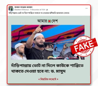সামাজিক যোগাযোগমাধ্যমে ‘আমার দেশ’ পত্রিকার লোগোযুক্ত একটি ফটোকার্ড ছড়িয়ে পড়ে, যেখানে দাবি করা হয়—জামায়াতে ইসলামীর ঢাকা মহানগরী দক্ষিণের সেক্রেটারি ড. শফিকুল ইসলাম মাসুদ বলেছেন, আসন্ন ত্রয়োদশ জাতীয় সংসদ নির্বাচনে দাঁড়িপাল্লায় ভোট না দিলে কাউকে শান্তিতে থাকতে দেওয়া হবে না। ফেসবুকে ১১ ডিসেম্বর একটি ব্যক্তিগত প্রোফাইল থেকে ড. মাসুদের ছবি সংযুক্ত এই ফটোকার্ডটি প্রথম ছড়ায় এবং পরবর্তীতে একাধিক প্রোফাইল ও গ্রুপে তা শেয়ার করা হয়। ফটোকার্ডটিতে ‘আমার দেশ’ পত্রিকার লোগো, তারিখ এবং ওয়েবসাইটের ঠিকানা ব্যবহার করা হয়, যাতে সেটিকে বিশ্বাসযোগ্য দেখানো যায়।