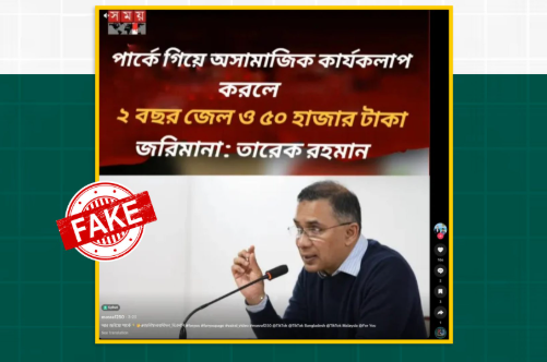 সাম্প্রতিক সময়ে সামাজিক যোগাযোগমাধ্যমে একটি ফটোকার্ড ভাইরাল হয়েছে, যেখানে দাবি করা হচ্ছে—বিএনপির চেয়ারম্যান ও বর্তমান প্রধানমন্ত্রী তারেক রহমান নাকি বলেছেন, “পার্কে গিয়ে অসামাজিক কার্যকলাপ করলে ২ বছর জেল ও ৫০ হাজার টাকা জরিমানা।” ফটোকার্ডটি সময় টিভির লোগো ব্যবহার করে ডিজাইন করা হয়েছে।