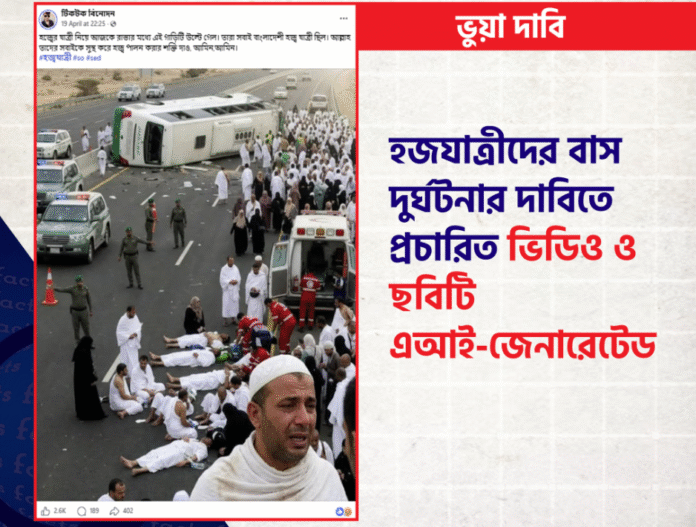 সামাজিক যোগাযোগমাধ্যমে সম্প্রতি একটি ভিডিও এবং একই দৃশ্যের একটি ছবি ছড়িয়ে পড়েছে, যেখানে দাবি করা হচ্ছে—বাংলাদেশি হজযাত্রীদের বহনকারী একটি বাস উল্টে ভয়াবহ দুর্ঘটনা ঘটেছে। কনটেন্ট দুটি “বাস্তব ঘটনা” হিসেবে উপস্থাপন করে ব্যাপকভাবে প্রচার করা হচ্ছে।