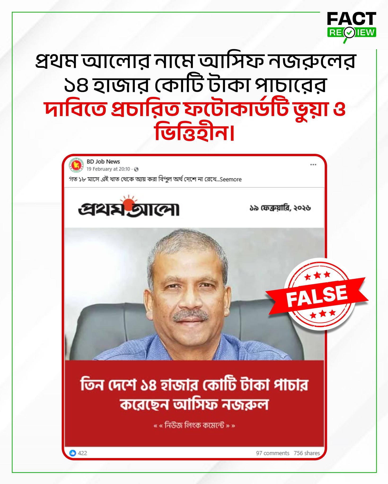‘তিন দেশে ১৪ হাজার কোটি টাকা পাচার করেছেন আসিফ নজরুল’—এমন শিরোনামে প্রথম আলোর ডিজাইন সম্বলিত একটি ফটোকার্ড সম্প্রতি সামাজিক যোগাযোগ মাধ্যমে ছড়িয়ে পড়েছে। তবে আলোচিত ফটোকার্ডটি যাচাই করে দেখা গেছে, এটি প্রথম আলো প্রকাশ করেনি।
