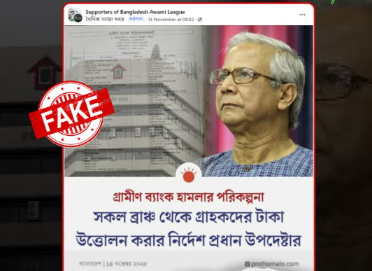 এই ঘটনার পর সামাজিক যোগাযোগমাধ্যমে একটি ফটোকার্ড ছড়িয়েছে—যেখানে দাবি করা হয়েছে, “গ্রামীণ ব্যাংকে হামলার পরিকল্পনা; সব শাখা থেকে গ্রাহকদের টাকা তুলতে নির্দেশ দিয়েছেন প্রধান উপদেষ্টা ড. মুহাম্মদ ইউনূস।” ফটোকার্ডটিতে প্রথম আলোর লোগো ব্যবহার করা হয়েছে।
