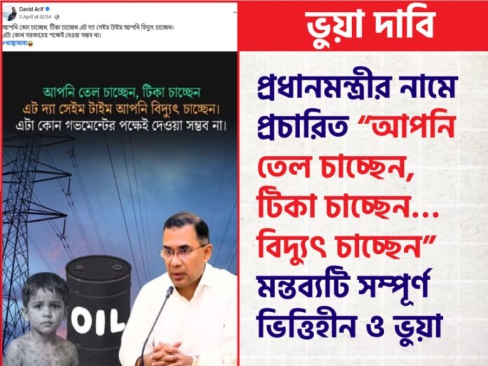 সাম্প্রতিক সময়ে সামাজিক যোগাযোগমাধ্যমে একটি পোস্ট ভাইরাল হয়েছে, যেখানে দাবি করা হচ্ছে—প্রধানমন্ত্রী নাকি বলেছেন, “আপনি তেল চাচ্ছেন, টিকা চাচ্ছেন এট দ্যা সেইম টাইম আপনি বিদ্যুৎ চাচ্ছেন। এটা কোন গভমেন্টের পক্ষেই দেওয়া সম্ভব না।” পোস্টটি দ্রুত ছড়িয়ে পড়ে এবং অনেকেই এটিকে সত্য বলে মনে করছেন।