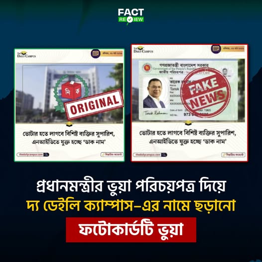 সামাজিক যোগাযোগমাধ্যমে প্রধানমন্ত্রীর ভুয়া পরিচয়পত্র ব্যবহার করে দ্য ডেইলি ক্যাম্পাস–এর নামে একটি ফটোকার্ড ছড়িয়ে পড়েছে। তবে যাচাই করে দেখা গেছে, ফটোকার্ডটি দ্য ডেইলি ক্যাম্পাস প্রকাশ করেনি এবং এটি সম্পূর্ণ ভুয়া।