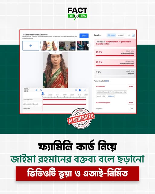 ফলে ফ্যামিলি কার্ড প্রসঙ্গে জাইমা রহমানের নামে প্রচারিত এই ভিডিওটি সম্পূর্ণ ভুয়া, এআই-নির্মিত এবং বিভ্রান্তিকর।