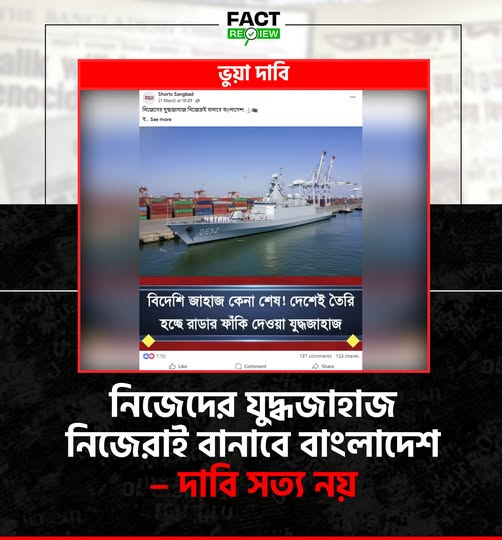 সামাজিক মাধ্যমে সম্প্রতি একটি ফটোকার্ড ছড়িয়ে পড়েছে, যেখানে বলা হচ্ছে বাংলাদেশ নৌবাহিনী চট্টগ্রামের চট্টগ্রাম ড্রাইডক লিমিটেড (CDDL)-এ ৬টি অত্যাধুনিক মাল্টি-রোল গাইডেড মিসাইল স্টেলথ ফ্রিগেট তৈরি করবে। পোস্টটিতে এটিকে নৌবাহিনীর “বায়ার নেভি থেকে বিল্ডার নেভি” হওয়ার পথে বড় অগ্রগতি হিসেবে উপস্থাপন করা হয়েছে এবং ২০৩০ সালের ‘ফোর্সেস গোল’ প্রজেক্টের সঙ্গে যুক্ত করার চেষ্টা করা হয়েছে।