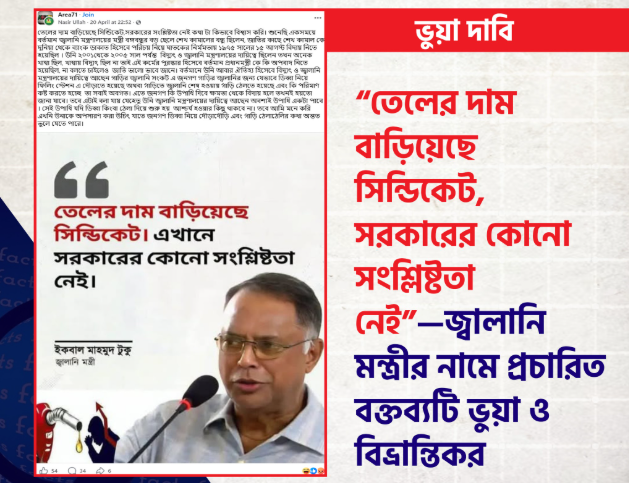 ফলে, বিদ্যুৎ ও জ্বালানি মন্ত্রীর নামে প্রচারিত “তেলের দাম বাড়িয়েছে সিন্ডিকেট, সরকারের কোনো সংশ্লিষ্টতা নেই” শীর্ষক বক্তব্যটি মিথ্যা, বানোয়াট এবং বিভ্রান্তিকর।