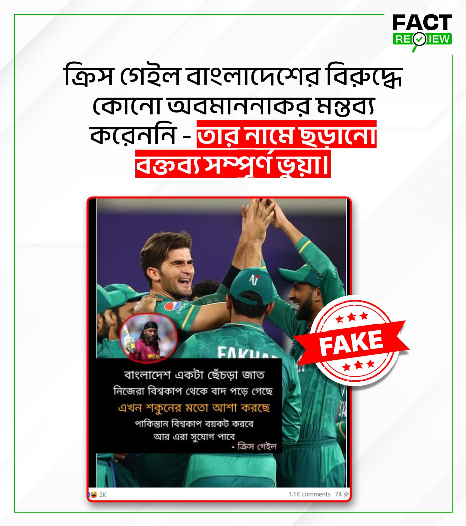 সম্প্রতি ভারত থেকে পরিচালিত কয়েকটি সামাজিক যোগাযোগমাধ্যম অ্যাকাউন্টে দাবি ছড়ানো হয়—ওয়েস্ট ইন্ডিজের সাবেক ক্রিকেটার ক্রিস গেইল নাকি বাংলাদেশকে ‘ছেঁচড়া জাত’ ও ‘শকুনের মতো সুযোগসন্ধানী’ বলে মন্তব্য করেছেন।