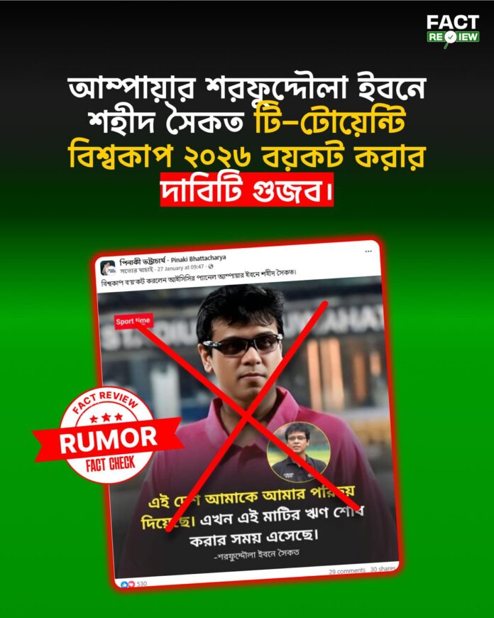 সামাজিক যোগাযোগ মাধ্যমে দাবি করা হয়েছে, আইসিসির এলিট প্যানেলের বাংলাদেশি আম্পায়ার শরফুদ্দৌলা ইবনে শহীদ সৈকত টি-টোয়েন্টি বিশ্বকাপ ২০২৬ বয়কট করেছেন। এই দাবিটি ফেসবুক, ইউটিউব এবং ইনস্টাগ্রামসহ বিভিন্ন প্ল্যাটফর্মে ছড়িয়ে পড়ে। অনেক পোস্টে বলা হয়, বাংলাদেশের বিশ্বকাপ বয়কটের সিদ্ধান্তের পর সৈকতও একই সিদ্ধান্ত নিয়েছেন।