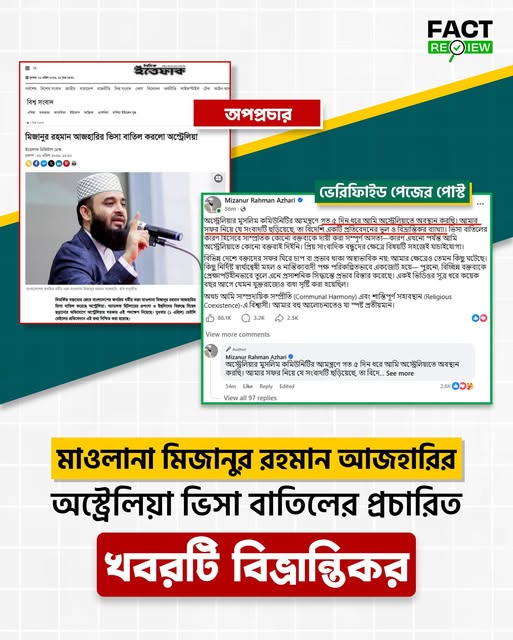 সম্প্রতি সামাজিক যোগাযোগমাধ্যম এবং কিছু আন্তর্জাতিক গণমাধ্যমে দাবি করা হচ্ছে যে বাংলাদেশের ধর্মীয় বক্তা মাওলানা মিজানুর রহমান আজহারির অস্ট্রেলিয়ার ভিসা বাতিল করা হয়েছে। এই দাবিতে উল্লেখ করা হয়েছে, আজহারি হিটলারের প্রশংসা করেছেন এবং ইহুদিদের নিয়ে বিরূপ মন্তব্য করেছেন, যেমন “ইহুদিরা বিশ্বের সবচেয়ে বড় সন্ত্রাসী” এবং “বিষাক্ত কলঙ্ক” বলে অভিহিত করেছেন। এই খবরের সঙ্গে সংশ্লিষ্ট কিছু পোস্টে তাঁর ছবি এবং অস্ট্রেলিয়ার পতাকা বা সরকারি লোগো ব্যবহার করে বিভ্রান্তিকর ফটোকার্ড তৈরি করা হয়েছে, যা দ্রুত সামাজিক যোগাযোগমাধ্যমে ছড়িয়ে পড়েছে।