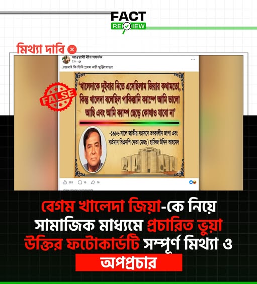 সামাজিক যোগাযোগমাধ্যমে একটি ফটোকার্ড ছড়িয়ে পড়েছে, যেখানে দাবি করা হচ্ছে যে ১৯৮৬ সালে জাতীয় সংসদে তৎকালীন জাপা নেতা (বর্তমান জাতীয় সংসদের স্পিকার ) হাফিজ উদ্দিন আহমেদ নাকি বলেছেন—“খালেদাকে দুইবার নিতে এসেছিলাম জিয়ার কথামতো, কিন্তু খালেদা বলেছিল পাকিস্তানি ক্যাম্পে আমি ভালো আছি এবং আমি ক্যাম্প ছেড়ে কোথাও যাবো না।”