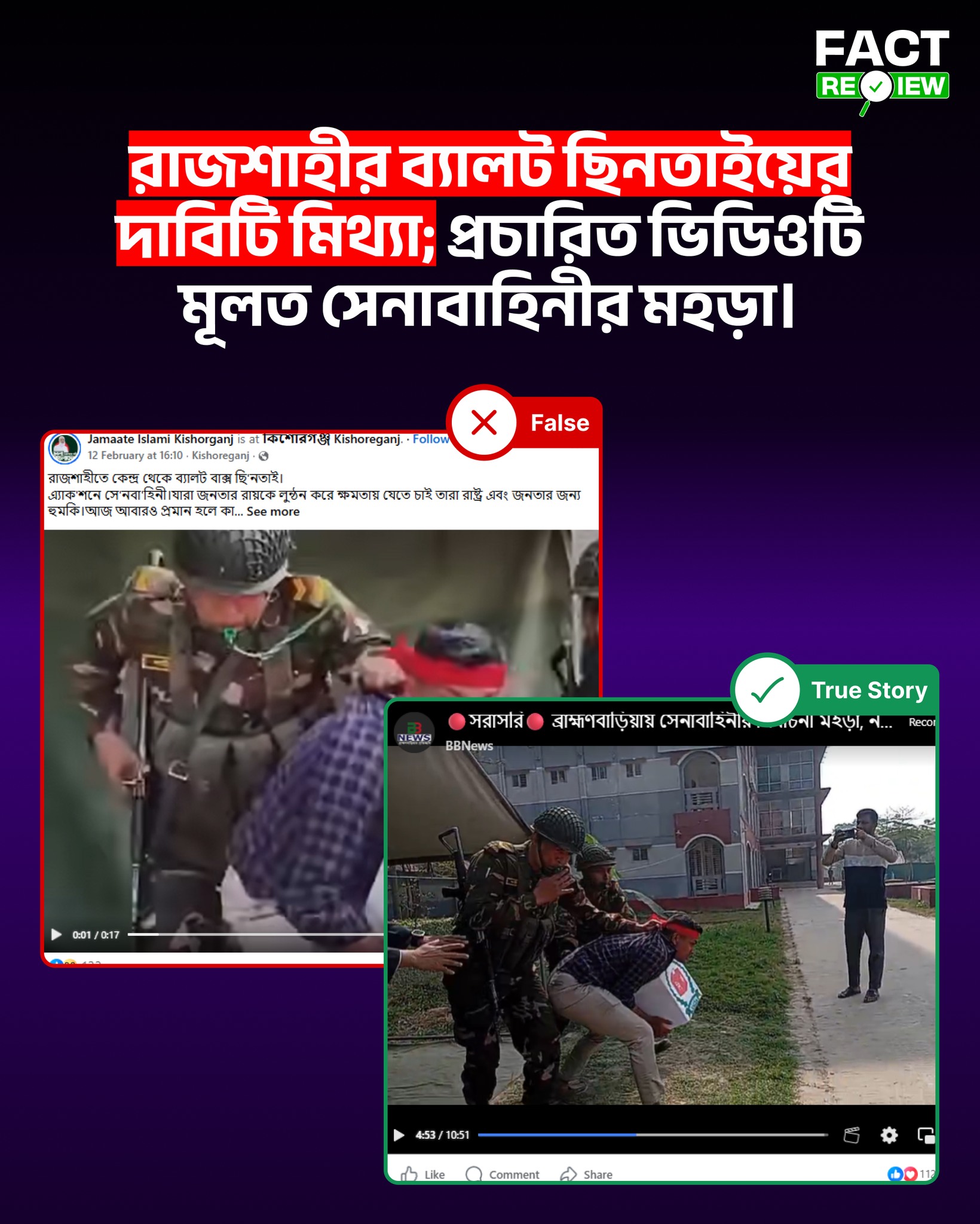 সম্প্রতি ফেসবুকে ‘রাজশাহীতে কেন্দ্র থেকে ব্যালট বাক্স ছিনতাই, এ্যাকশনে সেনাবাহিনী’— এমন দাবিতে একটি ভিডিও ছড়িয়ে পড়ে। কিছু পোস্টে ঘটনাটিকে চট্টগ্রাম-৬ (রাউজান) আসনের কেন্দ্রের বলে উল্লেখ করা হয়। তবে অনুসন্ধানে দেখা গেছে, ভিডিওটি চলতি বছরের ৮ ফেব্রুয়ারির এবং এটি কোনো বাস্তব ছিনতাইয়ের ঘটনা নয়। রিভার্স ইমেজ সার্চের মাধ্যমে ব্রাহ্মণবাড়িয়ার স্থানীয় সংবাদমাধ্যম ‘BB News’-এর ফেসবুক পেজে একই ভিডিও খুঁজে পাওয়া যায়, যেখানে এটি নির্বাচনকালীন সহিংসতা মোকাবিলায় বাংলাদেশ সেনাবাহিনীর একটি বাস্তবধর্মী মহড়ার দৃশ্য হিসেবে প্রকাশিত হয়েছিল। ভাইরাল ভিডিওর নির্দিষ্ট অংশের সঙ্গে মূল ভিডিওর মিল পাওয়া গেছে।
