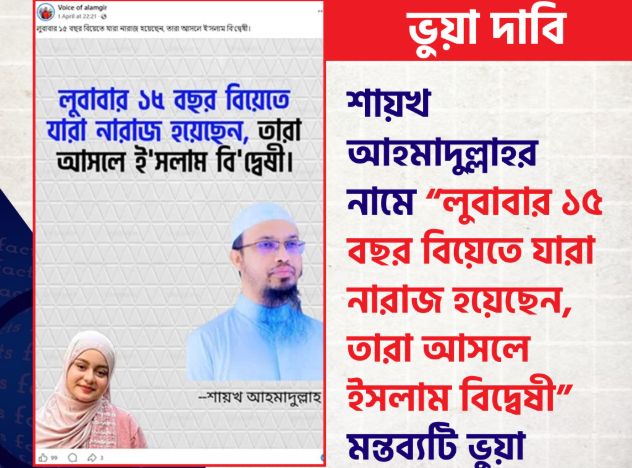 শায়খ আহমাদুল্লাহর নামে প্রচারিত “লুবাবার ১৫ বছর বিয়েতে যারা নারাজ হয়েছেন, তারা আসলে ইসলাম বিদ্বেষী” মন্তব্যটি সম্পূর্ণ ভিত্তিহীন এবং ভুয়া।