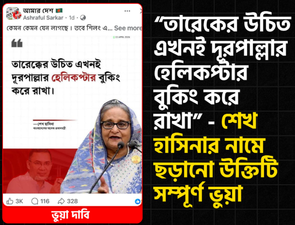 সম্প্রতি সামাজিক যোগাযোগ মাধ্যমে একটি নিউজ ফটোকার্ডের আদলে তৈরি ছবি ভাইরাল হয়েছে। সেখানে দাবি করা হচ্ছে, বাংলাদেশের সাবেক প্রধানমন্ত্রী শেখ হাসিনা বর্তমান প্রধানমন্ত্রী তারেক রহমানকে উদ্দেশ্য করে বলেছেন, “তারেকের উচিত এখনই দূরপাল্লার হেলিকপ্টার বুকিং করে রাখা।”