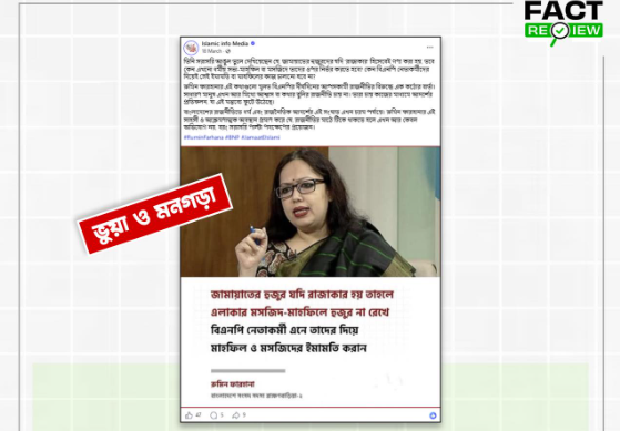 সামাজিক যোগাযোগমাধ্যমে সম্প্রতি একটি মন্তব্য ব্যাপকভাবে প্রচার করা হচ্ছে, যেখানে দাবি করা হচ্ছে—ব্রাহ্মণবাড়িয়া-২ আসনের স্বতন্ত্র সংসদ সদস্য রুমিন ফারহানা নাকি বলেছেন, “জামায়াতের হুজুর যদি রাজাকার হয় তাহলে এলাকার মসজিদ-মাহফিলে হুজুর না রেখে বিএনপি নেতাকর্মী এনে তাদের দিয়ে মাহফিল ও মসজিদের ইমামতি করান।” বক্তব্যটি উদ্ধৃতি আকারে ছড়িয়ে দিয়ে তা তার অবস্থান হিসেবে উপস্থাপন করা হচ্ছে।