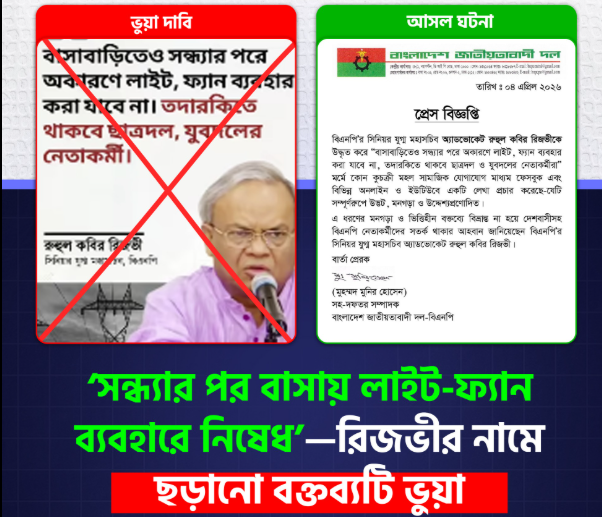 সন্ধ্যার পর বাসাবাড়িতে লাইট-ফ্যান ব্যবহারে নিষেধাজ্ঞা সংক্রান্ত রিজভীর নামে প্রচারিত বক্তব্যটি সম্পূর্ণ মিথ্যা, ভিত্তিহীন এবং বিভ্রান্তিকর।