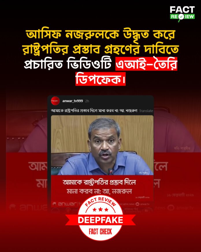 সুতরাং, সাবেক উপদেষ্টা আসিফ নজরুল রাষ্ট্রপতির প্রস্তাব পেলে তা গ্রহণ করবেন—এমন দাবিতে প্রচারিত ভিডিওটি ভুয়া এবং এআই প্রযুক্তি ব্যবহার করে তৈরি একটি ডিপফেক।