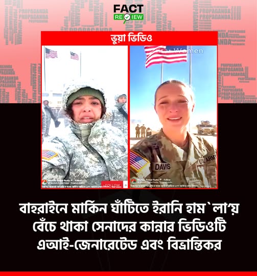 তবে অনুসন্ধানে দেখা গেছে, প্রচারিত ভিডিও দুটি আসল নয়। এগুলো কৃত্রিম বুদ্ধিমত্তা (AI) ব্যবহার করে তৈরি করা হয়েছে এবং বাহরাইনে কোনো মার্কিন ঘাঁটিতে ২০০ জন সেনা নিহত হয়েছে এমন দাবির কোনো নির্ভরযোগ্য প্রমাণ পাওয়া যায়নি।