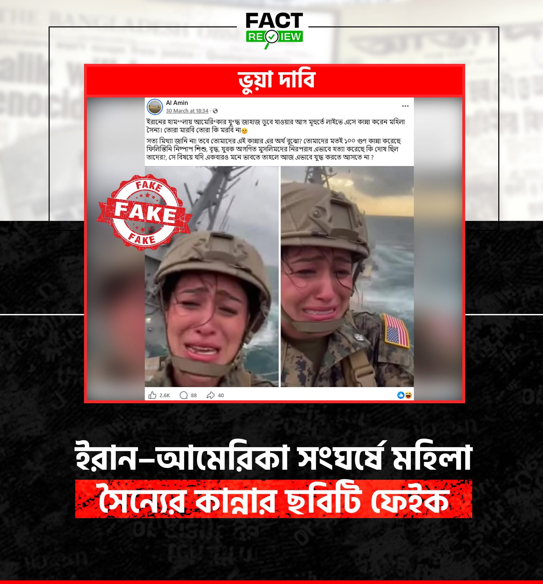 সামাজিক যোগাযোগমাধ্যমে সম্প্রতি একটি পোস্ট ভাইরাল হয়েছে, যেখানে দাবি করা হয়েছে যে “ইরানের হামলায় আমেরিকার যুদ্ধজাহাজ ডুবে যাওয়ার আগে একটি মহিলা সৈন্য লাইভে এসে কান্না করেছেন।” পোস্টে আরও যুক্ত করা হয়েছে, এই কান্নার সাথে ফিলিস্তিনি শিশু, বৃদ্ধ ও যুবকদের হত্যার ব্যাখ্যা যুক্ত করে সেনাদের প্রতি নৈতিক তর্ক তোলা হয়েছে।