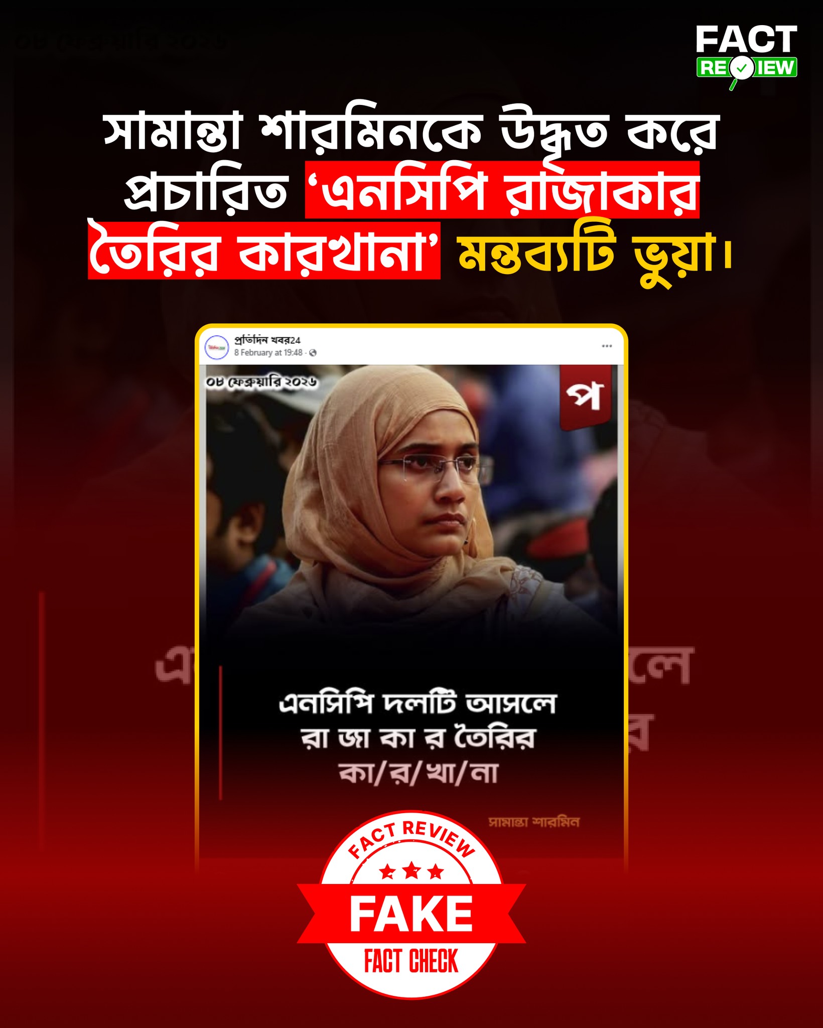 সম্প্রতি সামাজিক যোগাযোগমাধ্যমে জাতীয় নাগরিক পার্টির (এনসিপি) জ্যেষ্ঠ যুগ্ম আহ্বায়ক সামান্তা শারমিনকে উদ্ধৃত করে একটি ফটোকার্ড ছড়িয়ে পড়ে। সেখানে দাবি করা হয়, তিনি ‘এনসিপি দলটি আসলে রাজাকার তৈরির কারখানা’ বলে মন্তব্য করেছেন। এই ফটোকার্ডটি দ্রুত সামাজিক মাধ্যমে প্রচারিত হয়ে বিভ্রান্তি সৃষ্টি করে।