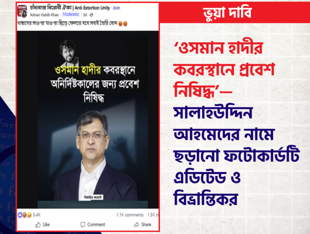 সালাহউদ্দিন আহমেদের নামে প্রচারিত ‘ওসমান হাদীর কবরস্থানে প্রবেশ নিষিদ্ধ’ সংক্রান্ত ফটোকার্ডটি সম্পূর্ণ এডিটেড, ভুয়া এবং বিভ্রান্তিকর।