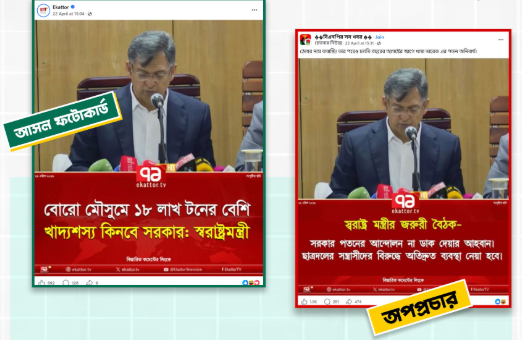 বরং, একই তারিখে প্রকাশিত গণমাধ্যমটির একটি ভিন্ন ফটোকার্ড পাওয়া যায়, যেখানে বোরো মৌসুমে খাদ্যশস্য সংগ্রহ সংক্রান্ত সরকারি সিদ্ধান্তের তথ্য রয়েছে। সেই আসল ফটোকার্ডের ডিজাইন, ছবি এবং গ্রাফিক্যাল উপাদানের সঙ্গে ভাইরাল ফটোকার্ডটির মিল থাকলেও শিরোনাম সম্পূর্ণ পরিবর্তন করে ভিন্ন বক্তব্য যুক্ত করা হয়েছে।